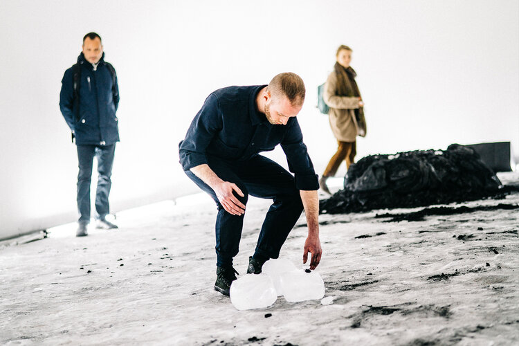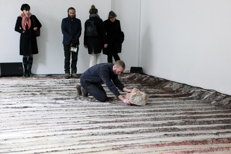 In terms of the process of creation, I am always very attracted to matter like ice, earth, sand or immaterial like sound, water vapor. For Ensemble Movement (Sacre) I used these natural materials to arrange the space. There was also a mode of repetition and endurance, simple and archaic gestures to better question our modes of perception of time and space, our habits of seeing, our prejudices of attention or inattention. As Perec wrote, I like to “resurrect the infra-ordinary”.